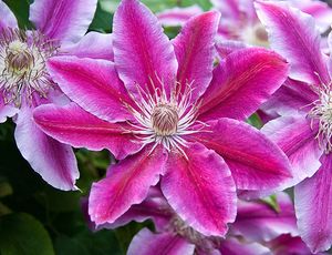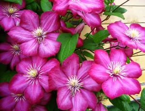 ✿ Группа Винцелла - лианы кустовой формы, побеги до 3,5 м со сложными листьями и крупными цветами, диаметром до 12 см, с преобладанием розовых, пурпурных и красных оттенков. Могут образовывать до 100 цветов. Цветут на побегах этого года, которые к зиме полностью срезаются. Лучший сорт - "Ville de Lyon" (Виль де Лион) - великолепный обильноцветущий сорт с карминовыми цветами и побегами до 4 м длиной. Также популярны - "Ernest Markham", "Hagley Hybrid", "Принц Чарльз".
