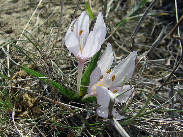 Безвременник анкарский или трехлистный, или Биберштейна (Colchicum ancyrense = Colchicum biebersteimi = Colchicum triphyllum) является одним из самых ранних эфемероидов – в отдельных случаях этот вид зацветает в конце декабря и заканчивает цветение в апреле. Растет в юго-западной части Украины, в Молдавии, западной части Турции, в Крыму. Имеет три узких сизых продолговатых желобчатых и реснитчатых по краям листка, 2-4 лилово-розовых цветка.