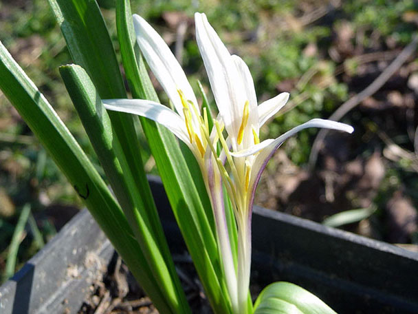 Колхикум осенний белый – встречается очень редко, из одной клубнелуковицы во второй половине сентября в количестве от пяти до семи штук зацветают цветки длиной до 15 см со снежно-белым околоцветником с желтым центром.
