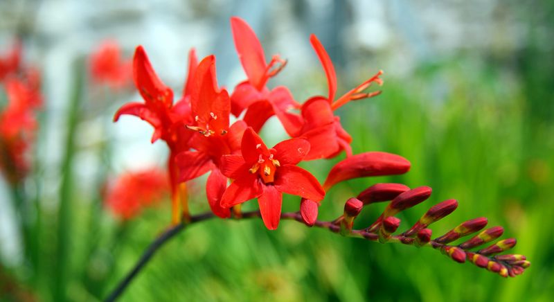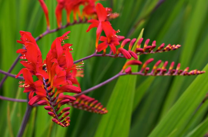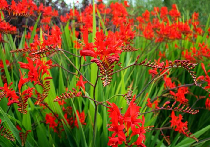❀ Крокосмия Ред Кинг – у этого сорта цветки яркого красного цвета с оранжевой серединой.