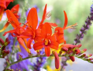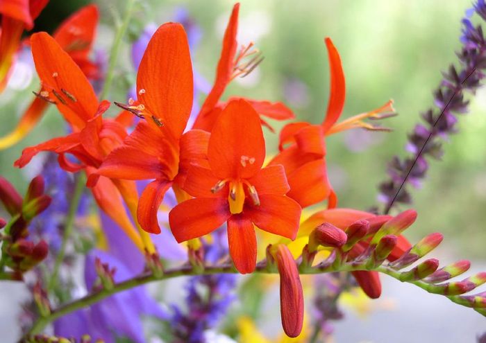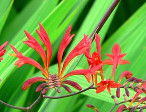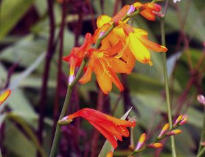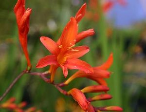Крокосмия (лат. Crocosmia), или монтбреция, или тритония, является луковичным растением, которое относится к семейству Ирисовые. Сегодняшняя культурная крокосмия представляет собой травянистый клубнелуковичный многолетний гибрид под названием крокосмия обыкновенная. Крокосмия – близкая родственница таких широко культивируемых садовых цветов, как крокус (шафран), ирис (касатик), феррария, гладиолус и фрезия. Она прекрасно выглядит на открытых клумбах в сочетании с такими цветами, как лилейник, канна, рудбекия, сальвия и эхинацея. Годится это растение и для срезки – соцветия крокосмии стоят в воде до двух недель.