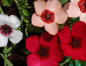 Достаточно массивный цветок высотой около 60 см имеет крупные простые цветки до 5 см в диаметре. Их окраска может быть красной, белой, розовой, есть сорт льна с красным глазком. Цветет С начала июня и до сентября. Стебли густо ветвятся вверху кустиков, но внизу практически оголены. Листья пусть и мелкие, но очень яркие. Такой лен – растение неприхотливое, к видам почв нетребовательно, к поливу также особых требований не предъявляет. Места посадки надо выбирать солнечные без застоя влаги – это, пожалуй, единственные критерии, которых надо придерживаться при выращивании льна. У однолетнего декоративного льна есть огромное число форм и сортов. Среди них наиболее распространены: