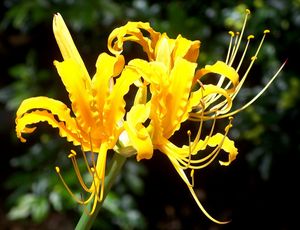 По форме представляет собой разновидность ликориса лучистого. Цветок отличают благородно-желтый окрас и бахромчатая курчавость лепестков. Тычинки обычно окрашены в белый цвет.