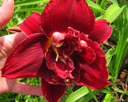 Лилейник ДАБЛ ФАЙЕРКРЕКЕР (Hemerocallis Double Firecracker)имеет крупные красные махровые цветы до 13 см в диаметре, горло - золотисто-зеленое. Сорт обильноцветущий, душистый. Срок цветения ранний, приходится на середину июля, сорт повторноцветущий. Высота растения - 60 см.