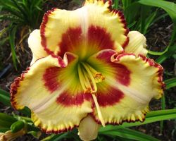 Лилейник «Lady Betty Fretz» имеет очень крупные кремовые цветки с ярко-красным глазом и сильно гофрированной двойной красно-желтой каймой. Горло желтое, в глубине зеленое. Ароматный сорт дневного цветения. Высота растения - 65 см, диаметр цветка - около 16 см.