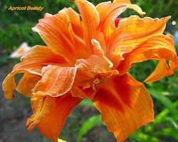 Сорт «Абрикосовая красавица» имеет махровые крупные цветки, достигающие в диаметре 12 см. В середине ярко-оранжевых лепестков выделяются красные мазки. Это растение вырастает в высоту до 70 см.