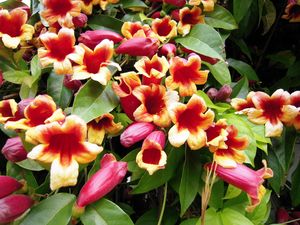 Вид вьющихся растений, который превосходно подходит для вертикального озеленения садов. Многолетние лианы достаточно быстро растут и радуют замечательным, обильным цветением все лето с июня по сентябрь. Длина лиан кампсиса достигает 15 м. Обрезать длинные плети растения необходимо в конце зимы. Цветы кампсиса имеют причудливую форму. Их длина примерно 7 см, диаметр нижней части 5-6 см. |
