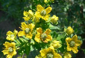 Рута душистая - полукустарник из семейства рутовых высотой 30-100 см с деревянистым, мочковатым корнем. Стебель одревесневший в нижней части, разветвленный, прямостоячий. Листья очередные, серовато-зеленые, слегка мясистые, дважды- или триждыперисторассеченные. Цветки правильные, зеленовато-желтые, на коротких цветоножках, собраны в щитковидную метелку. Плод — округлая 4-5-гнездная коробочка. В каждом гнезде 4-6 семян почти черного цвета. Цветет в июне — июле. Плоды созревают в сентябре — октябре. С лечебной целью используют свежую или высушенную траву, собранную в период цветения. Однако рута - ядовитое растение и требует осторожного применения. |
