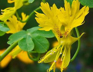 Эта лиана родом из Южной Америки. Ее светло-зеленые стебли которой достигают в длину 3,5 м и очень быстро заплетают беседки и шпалеры. Цветет она с середины лета до морозов ярко-желтыми мелкими цветками с гофрированными лепестками и шпорцами зеленого цвета. Листья некрупные, пяти- или семираздельные. Семена в средней полосе естественным путем созреть не успевают.