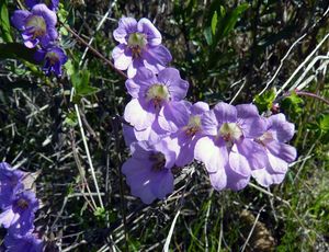 ✿ Везувий — кустик прямостоячий до 30 см высотой, по мере разрастания становится полустелющимся. Листья крупные, округлые, темно-зеленые. Цветки простые до 5 см в диаметре, лососево-розовые с оранжевым оттенком, на двух верхних лепестках темно-красное пятно со штрихами вокруг. Чашечка желтая.
