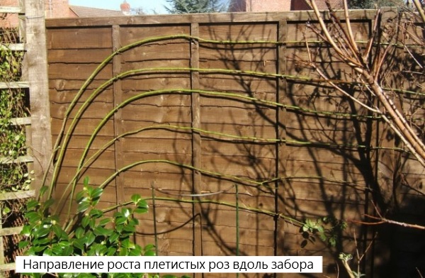 Побеги плетистых роз направляют не вертикально, а горизонтально или максимально близко к горизонтальному положению, тем самым уменьшая и природную расположенность плетистых растений расти только вверх, и стимулируя появление молодых веточек второго порядка, растущих на горизонтальных основных побегах. У плоских опор главные побеги привязывают горизонтально или наклонно по опоре или сетке, а там, где роза растет на узкой вертикальной опоре, ветки направляют наклонно, извилисто, волнообразно или закручивают вокруг опоры по спирали. Благодаря горизонтальному или почти горизонтальному направлению основных побегов, для достижения того же декоративного эффекта понадобится меньше ветвей, крону можно оставлять более редкую, что улучшит ситуацию с доступом к свежему воздуху и уменьшит риск распространения заболеваний.