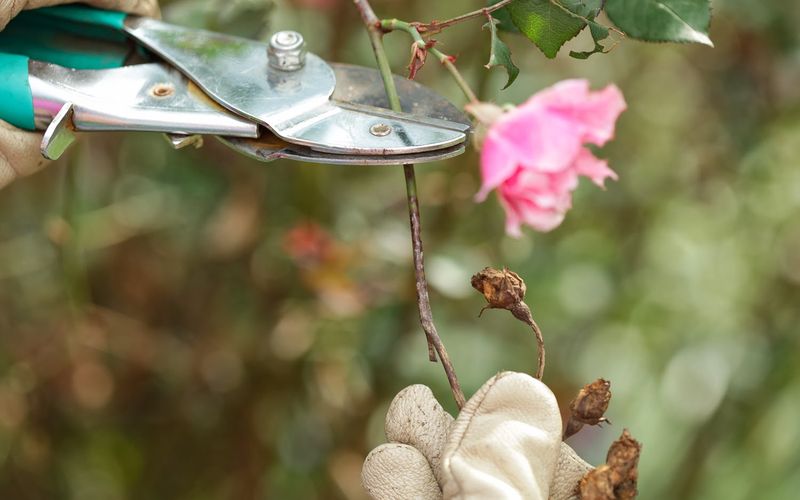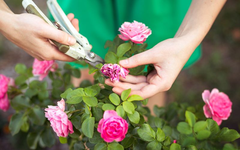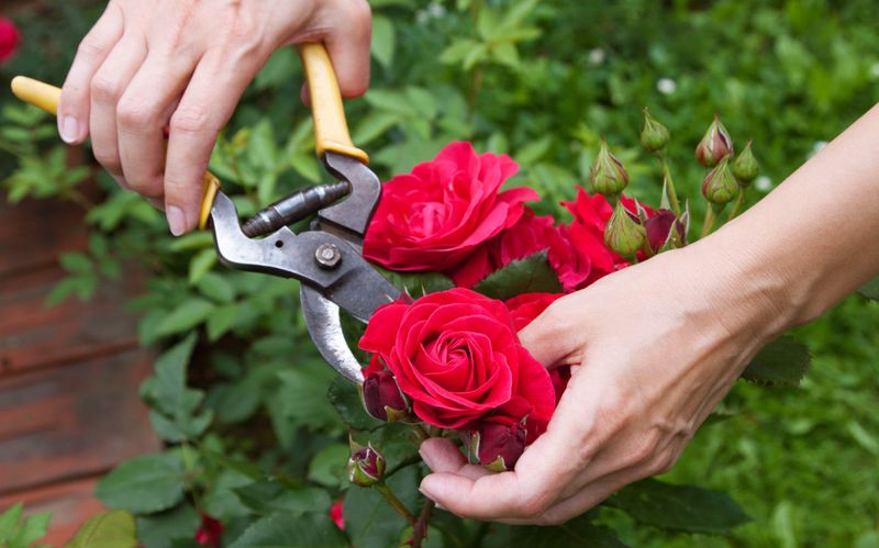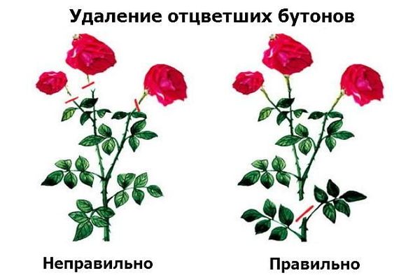 Срезают цветки не у самого основания, а оставляя короткие, до 1 см пеньки над глазком. Если у плетистой розы цветки расположены в плотных соцветиях, срезают все соцветие после начала увядания последнего цветка.