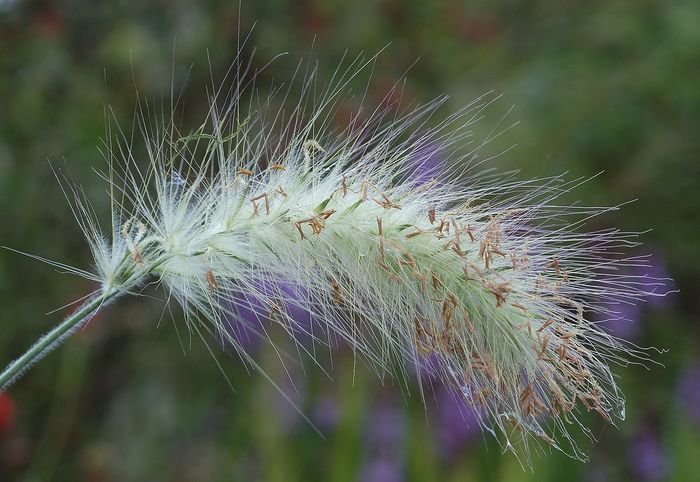 Перистощетинник лисохвостный является одним из самых популярных из всех видов, так как хорошо переносит зиму в средних широтах, и представляет собой декоративную культуру не только в период цветения, но и в осеннее время, когда основная вегетативная масса желтеет, а соцветия сохраняют свой цвет. На фото представлено растение в период цветения (середина-конец лета). Этот вид перистощетинников достигает высоты 0,9-1,1 м.