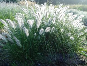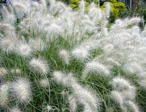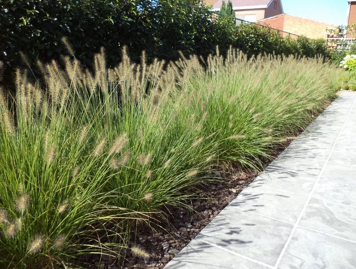 Пеннисетум в ландшафтном дизайнеПеннисетум активно используется в ландшафтном дизайне для озеленения частных домов. Культура используется преимущественно в пейзажном стиле, но в отдельных композициях, например, в рядовой посадке, может создавать регулярный эффект. Злаки красиво и гармонично смотрятся у водоемов в пейзажном стиле. Благодаря своей плакучей форме листьев и в некоторых сортах колосков достигается эффект естественности и гармоничности. Перистощетинник создает удачные композиции и в рядовых посадках, особенно у дорожек, как бы обрамляя и подчеркивая все остальные посадки растений по другую сторону. Посадив культуру очень густо и на расстоянии от дорожки можно создать эффект живой изгороди.