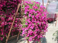 Ампельные петунии образуют удлиненные ниспадающие ответвления. С их помощью садоводы могут создавать декоративные шторки, ниспадающие водопады и другие причудливые фигуры. Очень красочно выглядят в кашпо петунии, ампельные сорта которых сочетаются между собой, например однотонная и звездчатая. Этими растениями иногда декорируют низкорослые деревья, флористические формы, беседки. Обычно, ампельные виды высаживают в кашпо, подвесные горшки или контейнеры. Но возможен вариант посадки в грунт. В этом случае, они застилают приличную площадь, закрывая проплешины на клумбах. Альпийские горки или берег искусственного водоема, украшенные ампельными петуниями, приобретают поистине сказочный вид. Сорта ампельной петунии очень разнообразны, отличаются внешним видом, длиной побегов, а также ростом и адаптацией к неблагоприятным погодным условиям. Длина побегов ампельной петунии, выращиваемой в средней полосе и на Урале, не превышает 100 см.