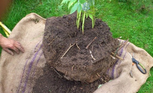 2. Из-за особенностей корневой системы пиона не допускается использовать лопаты для создания подкопа, более рациональным решением будет задействовать садовые вилы. С их помощью куст обкалывается по периметру и извлекается вместе с частью грунта, делать это нужно крайне осторожно, чтобы не нанести повреждений подземной части пиона, поскольку это негативно скажется на его адаптации после переноса на новое место.