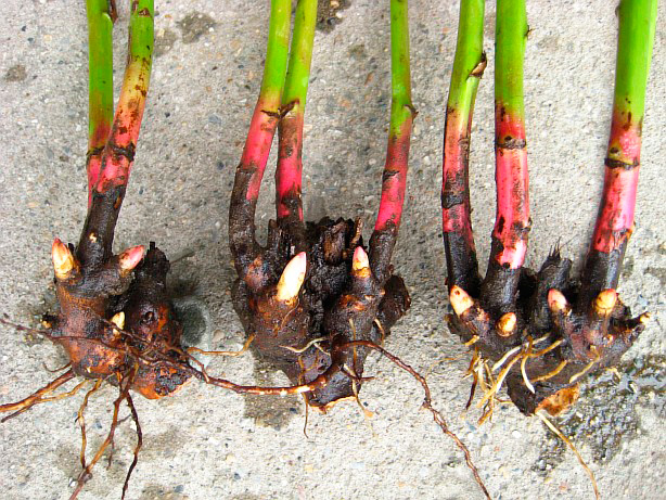 Деление корневища выполняют с помощью садового ножа. Делают это таким образом, чтобы на каждой деленке оказалось 2-3 корневища и 3-4 почки. Срезы и обломанные корни припудривают толченым углем.