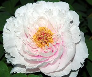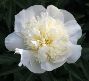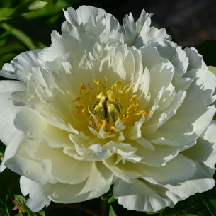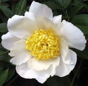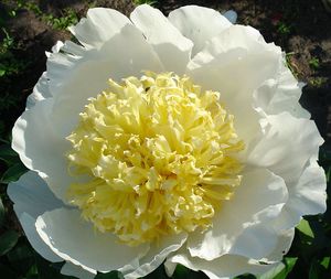 Очень эффектно смотрится японский сорт "Бу Ти" с белоснежными лепестками и яркими желтыми видоизмененными тычинками. Цветки очень крупные (20 см), цветут поздно. Куст нарастает быстро, очень сильный и здоровый, высотой до 90 см. Средне - поздний срок цветения. |