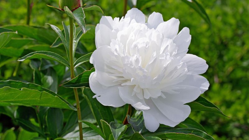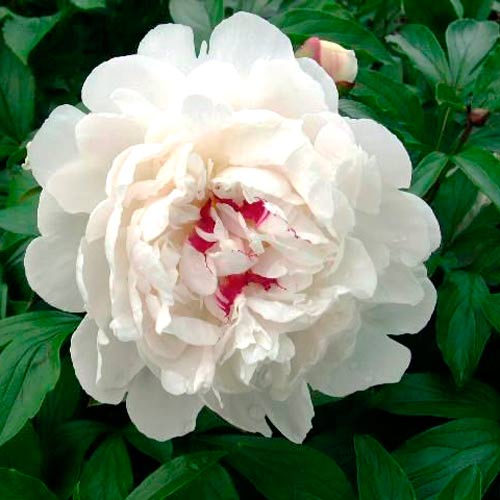 Растение формирует цветки невероятной красоты: 20-сантиметровые бутоны собраны из множества махровых лепестков. Большинство из них окрашены в белоснежный оттенок, те, что ближе к центру, – в ярко-малиновый. Наслаждаться оригинальным цветением этого пиона можно в период с мая по июнь. |