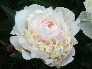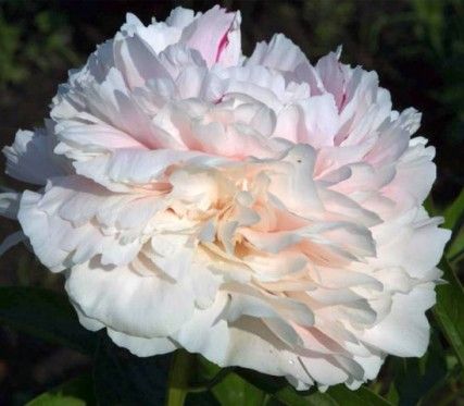 Чистота и нежность тонких волнистых молочно-белых лепестков, таящих где-то в глубине тёплые оттенки яблоневого цвета, восхищают и уносят в мир детства. Потрясающе красивые розовидные махровые цветки, до 16 см в диаметре, насыщают воздух тонким, очень приятным ароматом, создают атмосферу любви, бесконечной доброты и искренности. Куст плотный с тонкими прочными стеблями и тёмно-зелёными листьями высотой до 80—85 см, среднепозднего срока цветения. |