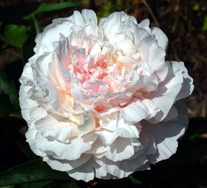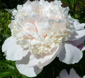 Густомахровый пион, нежного белого цвета, с едва уловимым розовым отсветом и чуть желтоватой середкой, из-за чего выглядит светящимся изнутри. Крупные, слегка волнистые лепестки с атласным отливом. Цветы размером 15-17 см, с приятным мягким ароматом. Цветение в средние сроки, начиная со второй половины июня. Темно-зеленая листва удачно контрастирует с уже распустившимися цветами и кремовыми бутонами. Высота растений 80-90 см, стебли прочные и крепкие, цветы можно не подвязывать. Морозостойкость до -43°С. Посадка на солнечном или с легкой кружевной тенью месте. |
