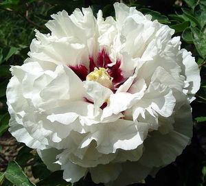 У этого зимостойкого сорта древовидных пионов лепестки почти чисто-белые, лишь в основании есть тонкие фуксиновые линии. Стаминодиальный диск белый. Тычиночные нити внизу светло-сиреневые, вверху белые; пестиков пять, рыльца светло-желтые. Куст высотой до 1,5 м. Листья насыщенного зеленого цвета. |