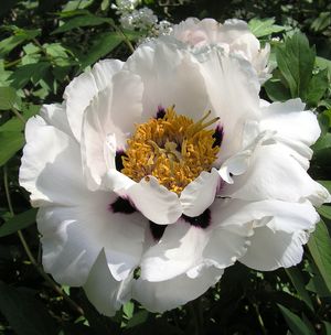 Сорт раннего срока цветения. Куст высотой 1,0-1,3 м, раскидистый. Листья узкие, короткие, зеленые. Черешок листа средний. Раскрытие бутонов быстрое. Цветки простые, диаметром 14-15 см. Лепестки чисто-белые, с почти черным пятном в основании, тычиночные нити белые, стаминодиальный диск красно-пурпурный, рыльце розовое. Период цветения короткий. Сорт устойчив к болезням и вредителям. |