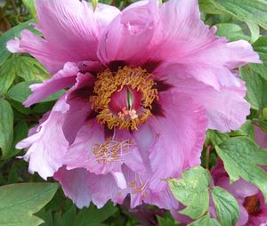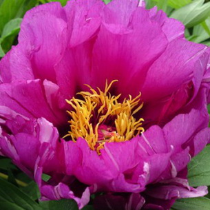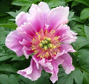 Пион японской формы. Розово-сиреневый, яркий. Стаминодии жёлтые. Стебли прямые. Листья сильно гофрированные. иаметр цветка 15 см. Высота куста 80 см. Запах слабый. Средний срок цветения. |
