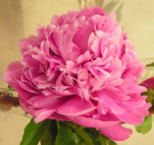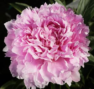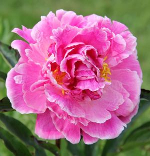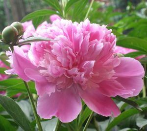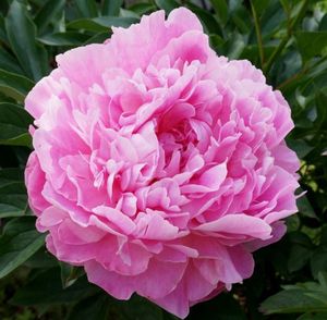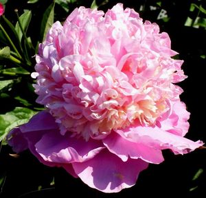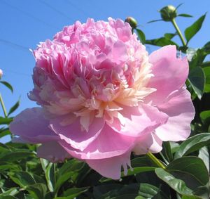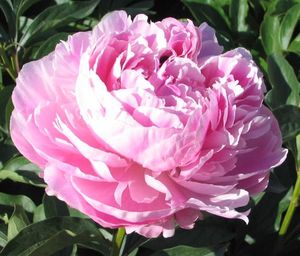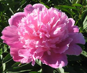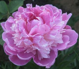 Махровый розовидный пион. Розовый, блестящий, с более светлым краем. Стебли сильные. Листья мощные, грубые, без блеска, тёмно-зелёные. Есть боковые бутоны. Диаметр цветка 14 см. Высота куста 90 см. Запах слабый. Поздний срок цветения. |