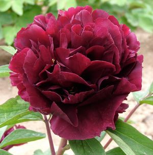 Роскошно смотрится в саду благодаря великолепным, пушистым, темно-пурпурного оттенка цветам. Они густомахровые, центральные лепестки плотно завернуты в середину, а боковые создают красивейшее оформление по краям. Куст вырастает до 1,5-2 м. Цвести начинает с середины июня. |