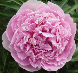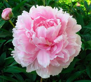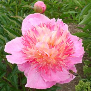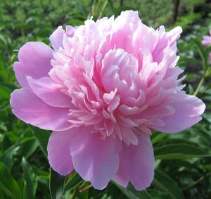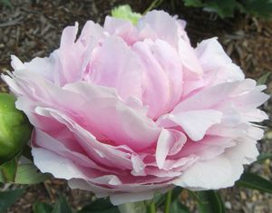 Махровый бомбовидный пион. Внешние лепестки широкие, слегка загибающиеся, остальные образуют шар из относительно узких лепестков. Светло-розовый, с кольцом светлых петалодий. Диаметр цветка 18 см. Высота куста 70 см. Запах слабый. Средний срок цветения. |