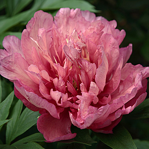 Махровый розовидный, плоский пион. Розовый, с оттенком лососёвого. Диаметр цветка 20 см. Стебли прочные, облиственные доверху. Листья среднего размера, суженные, лодочкой, тёмно-зелёные. Тычинки и пестики отсутствуют. Высота куста 90 см. Ароматный. Средний срок цветения. |