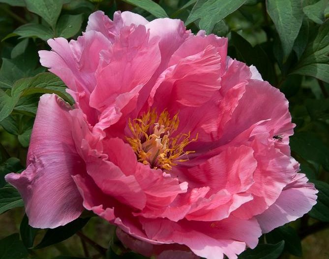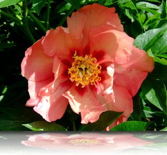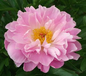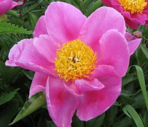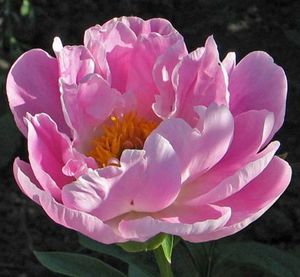 Пион японской формы. Розовый, стаминодии жёлтые. Стебли прямые. Листья крупные. Диаметр цветка 15 см. Высота куста 80 см. Запах слабый. Средний срок цветения. |