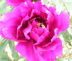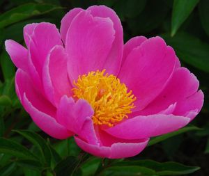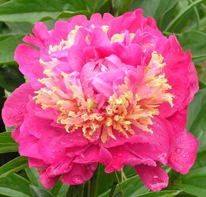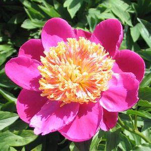 Пион японской формы. Ярко розовый, стаминодии того же цвета, с золотистыми кончиками. Стебли прямые. Диаметр цветка 14 см. Высота куста 90 см. Запах слабый. Средний срок цветения. |