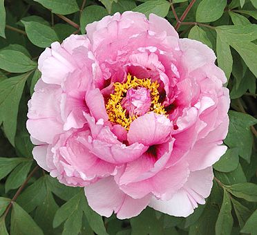 Старый, хорошо себя зарекомендовавший сорт японской селекции, давно любим российскими цветоводами. Цветок крупный, лепестки двурядные, розового оттенка. Стаминодии плоские, очень густо «набитые» в центре, желто-кремового цвета. Сорт ароматный, цветет поздно. |