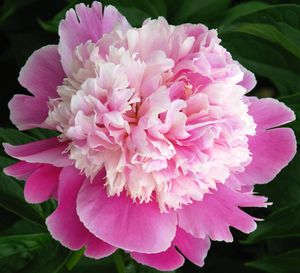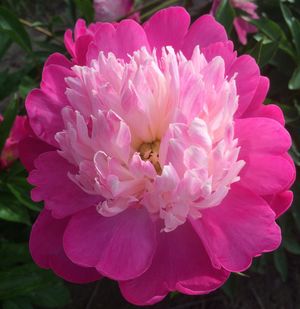 Махровый бомбовидный пион. Внешние лепестки ярко-розовые, центр - смесь белых и розовых лепестков. Тычинки отсутствуют. Есть пестики. Диаметр цветка 14 см. Куст высотой 90 см. Ароматный. Средний срок цветения. |