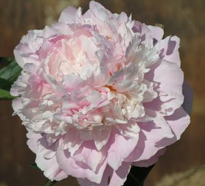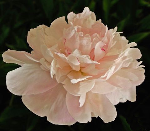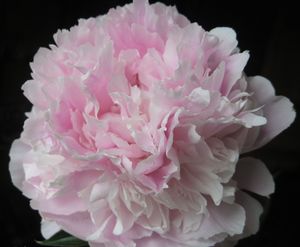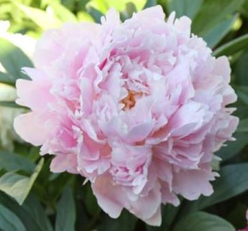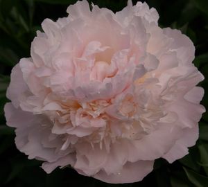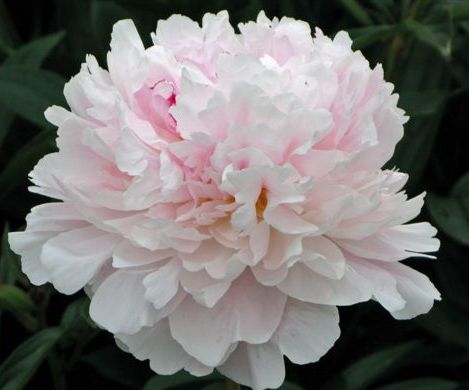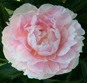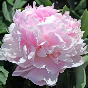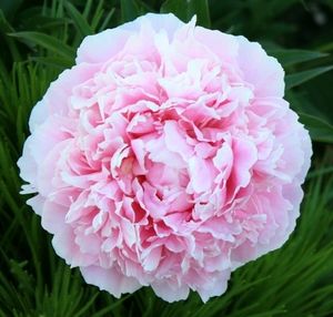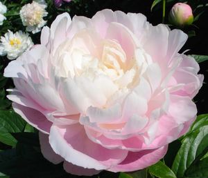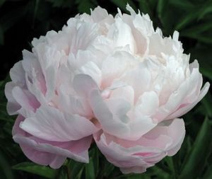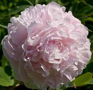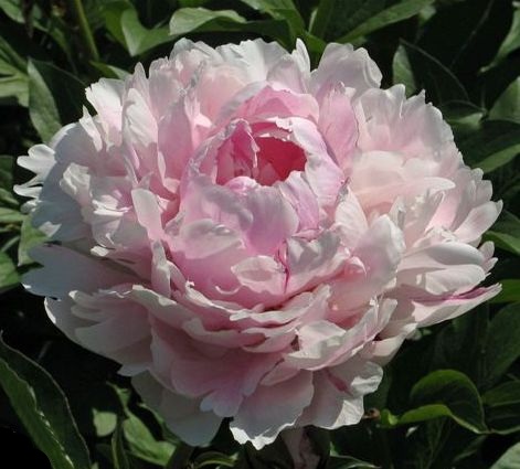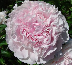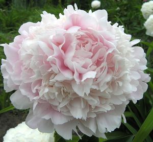 Махровый шаровидный пион, лепестки плотные. Светло-розовый оттенок на белом основании. Листья блестящие, зелёные. Диаметр цветка 16 см. Высота куста 80 см. Ароматный. Среднепоздний срок цветения. |
