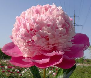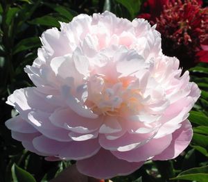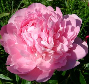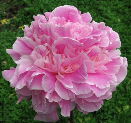 Огромный махровый пион. Светло-розовый, возможны красные кончики лепестков. Стебли прямые. Диаметр цветка 25 см. Высота куста 80 см. Запах слабый. Средне-поздний срок цветения. |
