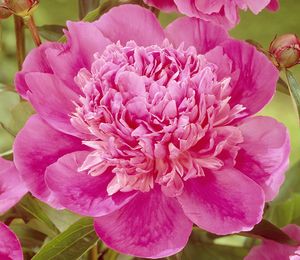 Махровый розовидный пион. Ярко-розовый. Есть боковые бутоны. Диаметр цветка 18 см. Высота куста 80 см. Ароматный. Средний срок цветения. |