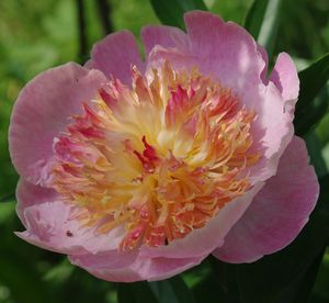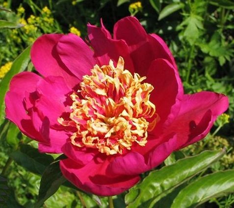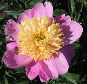 Сорт считается махровым, но иногда выглядит как типичный анемоновидный. Крупные внешние лепестки расположены в 1-2 ряда. В центре шар из ярко-желтых, потом кремово-желтых стаминодий, встречаются и светло-розовые узкие лепестки, иногда с карминовой окантовкой. Цветок очень нарядный из-за контрастной окраски лепестков и стаминодий. Диаметр цветка 16-17 см. Куст довольно компактный, высотой 60-75 см. Средне раннего срока цветения. |