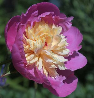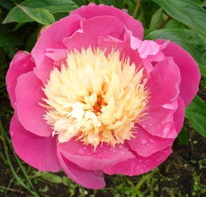 Пион японской формы. Малиново-розовый, стаминодии той же окраски с кремовой окантовкой, закручены внутрь. Стебли толстые, прочные. Листья тёмно-зелёные. Диаметр цветка 16 см. Высота куста 70 см. Ароматный. Средний срок цветения. |