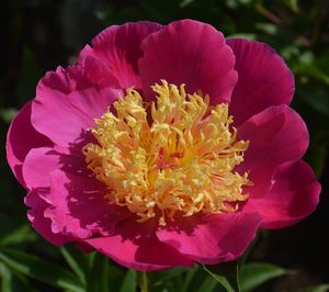 Пион японской формы, чашевидный. Ярко-розово с некрупным шаром светло-жёлтых стаминодий в центре. Есть боковые бутоны. Не выгорает. Жизнестойкий. Длительный срок цветения. Диаметр цветка 16 см. Высота куста 70 см. Запах слабый. Средне-поздний срок цветения. |