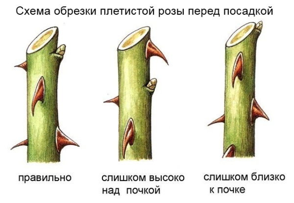 Перед посадкой весной саженцу с открытой корневой системой укорачивают побеги на 2 почки, в среднем - на 30 см в длину. Осенью обрезку стеблей не проводят, после посадки их укорачивают уже весной, после распускания листьев. Корни обрезают до живой белой ткани, в среднем - до 30 см, и присыпают толченым древесным углем для обеззараживания.