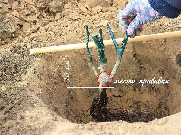 Погружая саженец в почву, следите, чтобы корневая шейка тоже была заглублена на 10 см – это защитит её от заморозков в холодное время года и позволит растению пустить собственные корни. При посадке следят, чтобы корневая система была расправлена и при засыпании землей не образовывались воздушные пустоты. Корни аккуратно расправляют, засыпают грунтом, слегка уплотняют его руками.