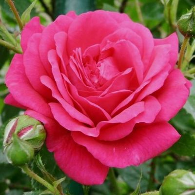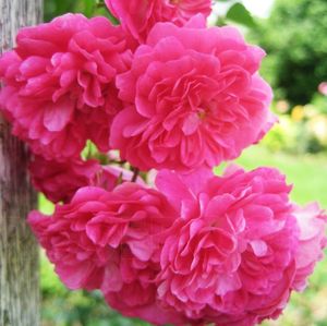 Клаймбер. Ремонтантный сорт. Душистые махровые насыщенно-розовые цветки весь сезон покрывают собой сильные здоровые ветви с тёмно-зелёными листьями. Замечательная роза, замечательное цветение! А какой настоящий розовый цвет! Цветки до 7 см в диаметре собраны в пряморастущие соцветия по 5-7 штук. Высота растения до 2,5 м. Относительно устойчив к грибным болезням. Зимует под укрытием. Лучше всего подходит для декорирования пергол, столбов, колонн, стен. |