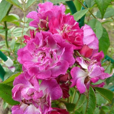 Клаймбер. Махровые цветы насыщенно-розового цвета, красивой формы, как у шрабов, собраны в кисти по 3-8 штук. Размер цветка 10-11 см. Имеют очень сильный аромат, напоминающий запах шиповника. В пик цветения, кусты покрыты цветами снизу и доверху, так густо, что листвы почти не видно. У молодых растений первая волна цветения обычно обильнее второй. Кусты сильные, с мощными побегами, быстро достигают 2,5 м высоты. Замечательно переносят как затяжные дожди, так и жару. Практически не поражаются грибными болезнями. Морозостойкость до -23°С без укрытия. Хорошо декорируют стены строений, пергол, террас. |