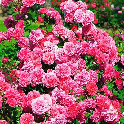 Клаймбер. Сорт с ароматными густомахровыми цветками кораллово-розового цвета. Каждый цветок плотный, шаровидной формы, до 9 см в ширину, с более чем 40 лепестками! Цветут они всё лето с июня по сентябрь, до первых морозов, источая приятный фруктово-цветочный аромат. Растение сильнорослое, высотой до 3 м, слабораскидистое, с тёмно-зелёными глянцевыми листьями и острыми колючками. Обладает хорошей зимостойкостью и устойчивостью к болезням. Подходит для выращивания на невысокой опоре. Посадка желательна на солнечном месте. |