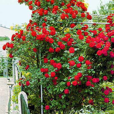 Клаймбер. Особенность этого сорта заключается в ярко-насыщенном красном цвете, который устойчив к выгоранию на солнце. Эффектно выглядят цветки, имеющие большие размеры. Обычно, когда розы начинают цвести, в диаметре их соцветия достигают 10 см. Кусты этого сорта редко когда вырастают более 3 метров. Розы этого сорта могут расти на любых грунтах, также они хорошо себя чувствуют и в различных погодных условиях. |