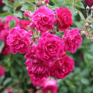 Клаймбер. Впечатляющие кисти крупных, до 12 см темно-розовых махровых цветов. В каждом более 100 лепестков чуть серебристых снаружи и со слегка волнистыми краями. Аромат сладкий яблочный, выраженный, но не назойливый. По мере роспуска цветы чуть светлеют. Первая волна цветения очень обильная, и сразу же после ее окончания появляются новые бутоны. Кусты высотой до 3,5 м, побеги колючие, нуждаются в опоре. Стойкость к дождям и основным заболеваниям роз очень высокая. Морозостойкость до -32°С! Можно формировать кустом. Сорт идеален для украшения стен, беседок, террас, арок. Отцветшие кисти лучше удалять. |