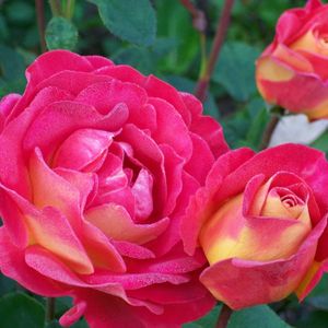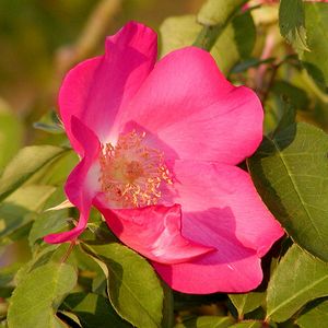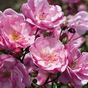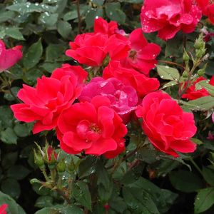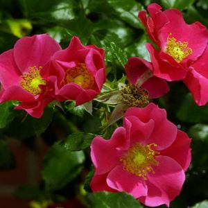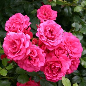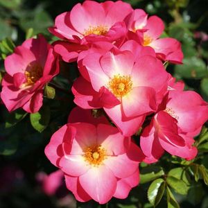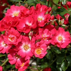 Уникальная роза, которая отлично сопротивляется всем видам болезней и легко переносит засуху или обильные дожди. Ценится также за удлинённый срок цветения и декоративность цветков — лепестки полумахровых кистевых соцветий окрашены в интенсивный карминный цвета, с контрастной светло розовой серединой. |